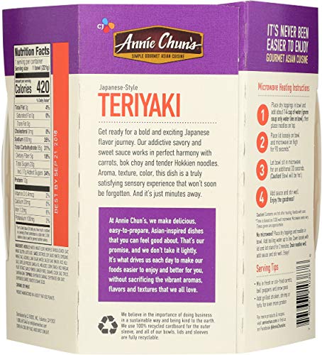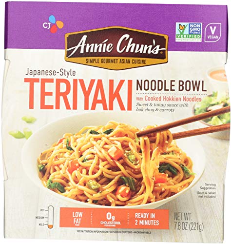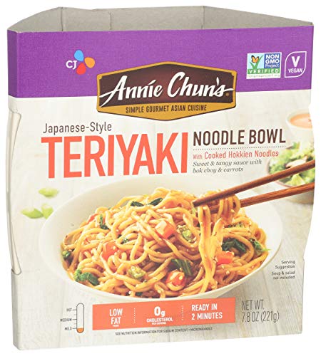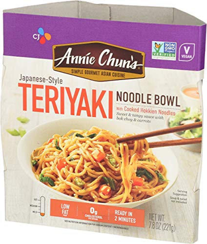 Annie Chun’s Teriyaki Noodle Bowl have combined layers of soy, shiitake, sesame oil, garlic and ginger with our fresh cooked Hokkien noodles for a quick and healthy meal that’s ready in just two minutes. Topped with tofu, carrots, and spinach, you’ll be sure to enjoy this vegetarian alternative – especially if you’re craving chicken teriyaki without the chicken. Product manufactured in a facility that uses peanuts.