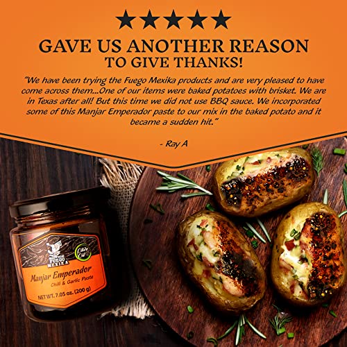 Turn any meal into a culinary voyage. Crown your dish with the “Emperor” of chili salsas – Fuego Mexika’s Manjar Emperador: Chili Blend and Garlic Paste in Olive Oil.