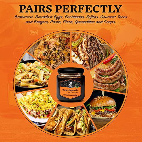 Manjar Emperador is crafted from a blend of Chipotle, Morita & Rojo de Arbol chili peppers, with natural Garlic, which are roasted and ground into a fine paste, then bathed in olive oil. It delivers a robust and spicy gourmet taste that pairs perfectly with a wide range of dishes.