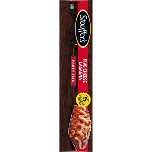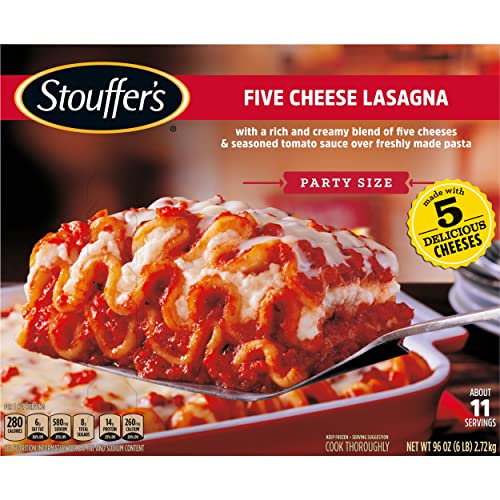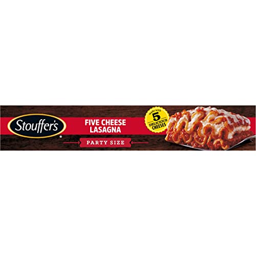 Stouffer’s Party Size Cheese Lovers Lasagna Frozen Meal combines quality ingredients and delicious flavor into one easy dinner. This Stouffers lasagna is made with lasagna noodles, seasoned tomato sauce, low fat ricotta, mozzarella, parmesan, romano and asiago cheeses, sure to satisfy every taste bud. This delicious Stouffer’s lasagna is made with 14 grams of protein per serving. This five cheese lasagna is easy to prepare in the oven, making this dish a great choice when you’re short on time. Keep Stouffer’s frozen pasta dinners in the freezer until you’re ready to enjoy.