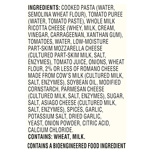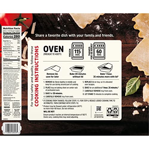 Includes frozen lasagna with seasoned tomato sauce and a blend of five cheeses